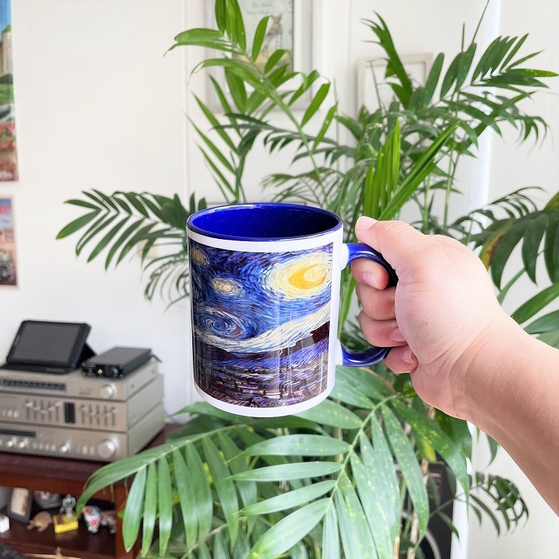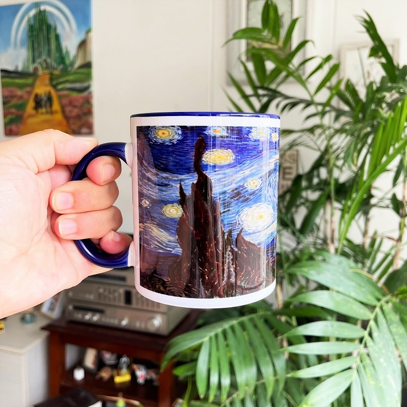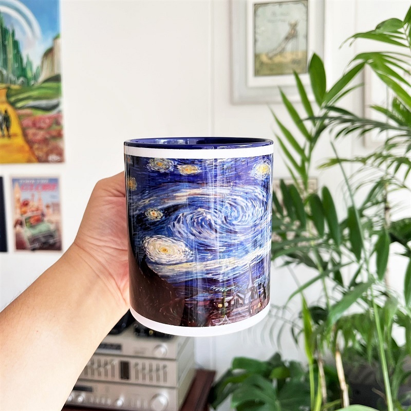 Esta taza tiene impresa la imagen del cuadro que pintó Vincent Van Ghog, La Noche Estrellada, alrededor de 1889.